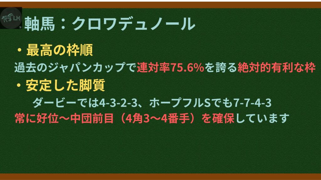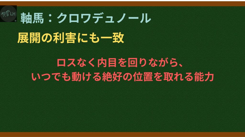 上記の展開予測とファクター分析を総合した結果、今回のレースでロジックが導いた軸馬は、クロワデュノールである。