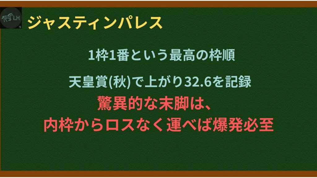 1枠1番という最高の枠順。天皇賞(秋)で上がり32.6を記録した驚異的な末脚は、内枠からロスなく運べば爆発必至です。