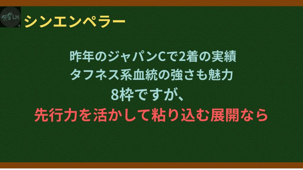 昨年のジャパンCで2着の実績があり、タフネス系血統の強さも魅力。8枠ですが、先行力を活かして粘り込む展開なら圏内です。