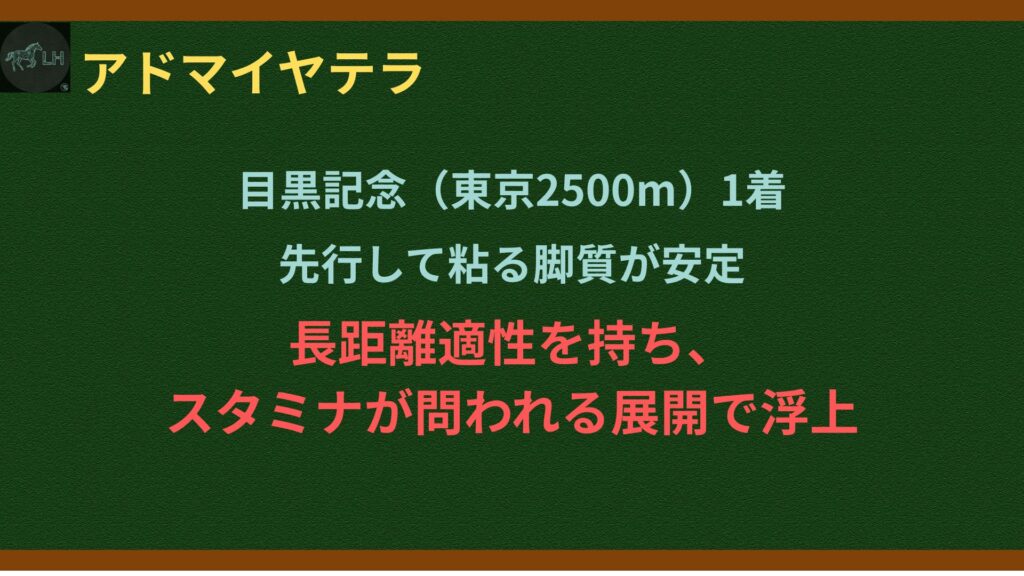 目黒記念(東京2500m)で1着。先行して粘る脚質が安定しており、長距離適性を持ち、スタミナが問われる展開で浮上します。