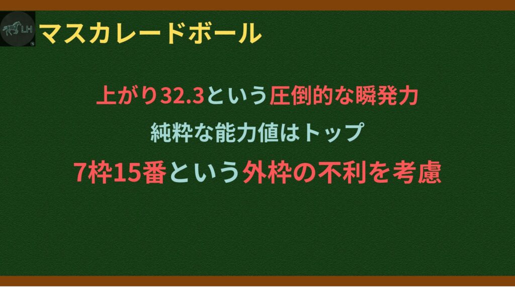 上がり32.3という圧倒的な瞬発力を持つ馬。ルメール騎手で、純粋な能力値はトップですが、7枠15番という外枠の不利を考慮し、相手評価としました。