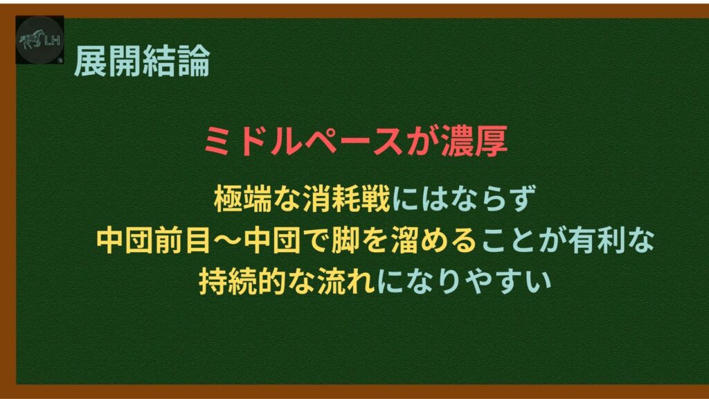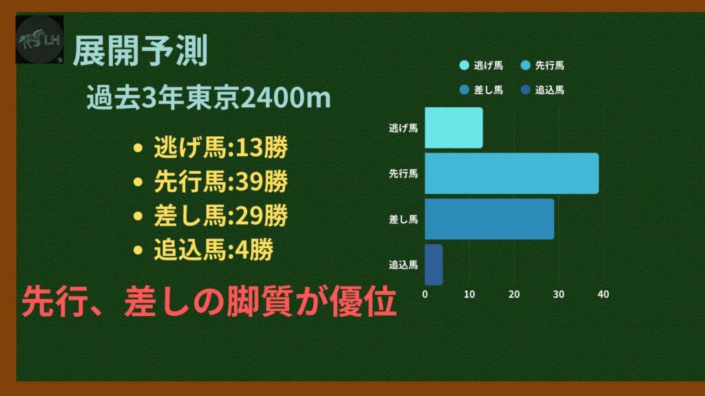 過去の東京2400mのデータ、今年のメンバー構成から、極端な逃げ馬は不在で、各馬が前目を取りに行くため、レースはミドルペースになる可能性が濃厚です。