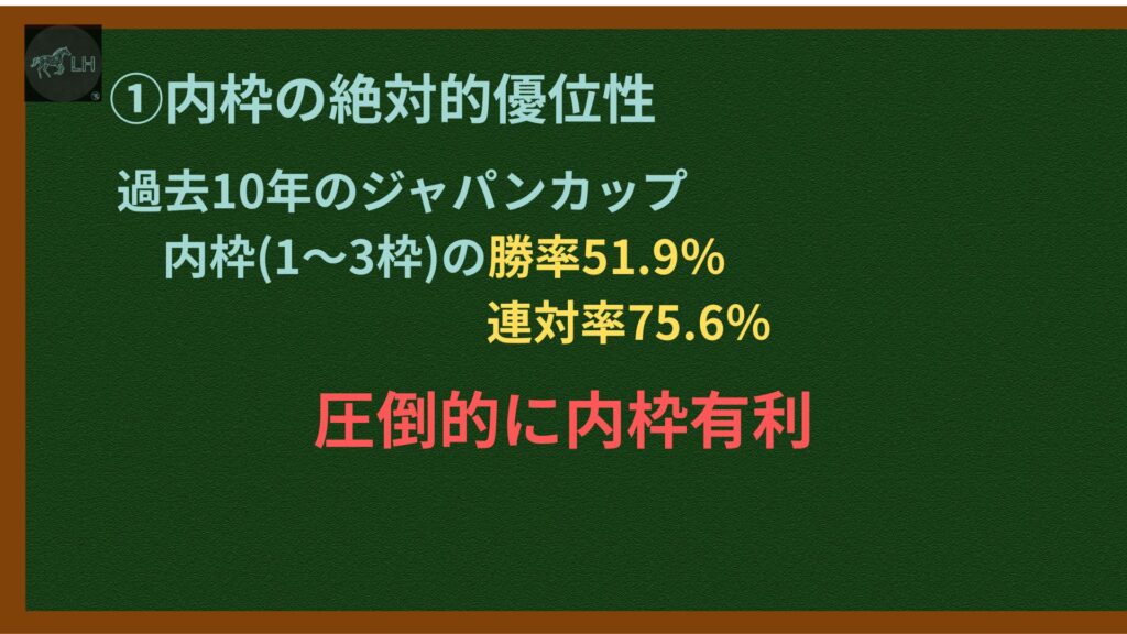 - 内枠(1~3枠)の勝率51.9%、連対率75.6%
