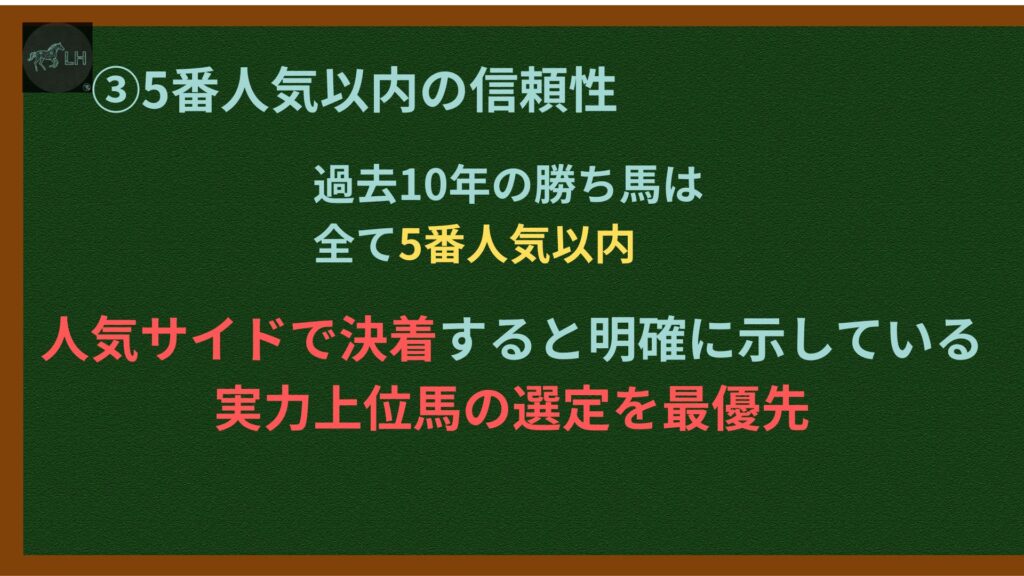 過去10年の勝ち馬は全て5番人気以内から出ています。データは人気サイドで決着すると明確に示しており、実力上位馬の選定を最優先します。