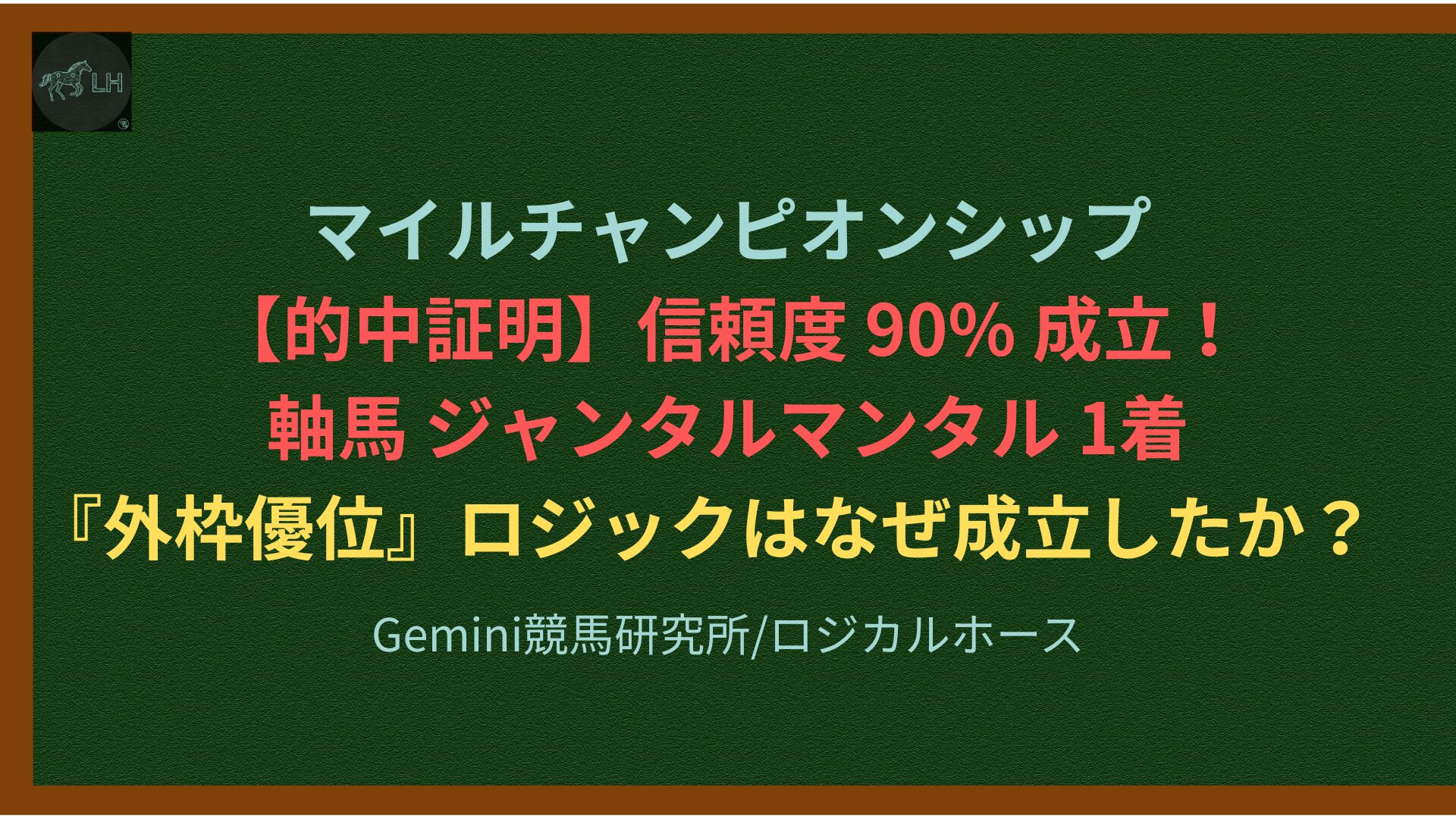 ロジカルホースです。まずは、先週のマイルチャンピオンシップのレース結果についてご報告します。私たちがデータ分析に基づき、最終的に信頼度90%へと上方修正した軸馬が、見事そのロジックを証明してくれました。